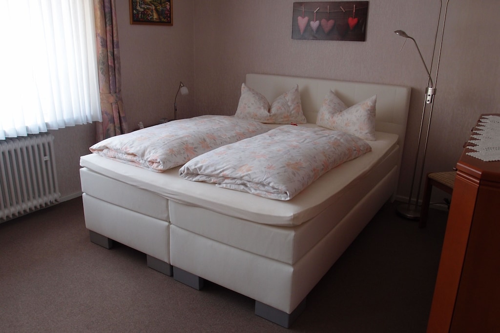 Das Schlafzimmer verfügt über ein Boxspringbett, auf dem Sie schlafen wie auf Wolken. Sie finden hier ebenfalls einen geräumigen Schlafzimmerschrank, eine Kommode und ein großes Fenster für frische Luft.